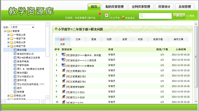 為每個教師提供資源上傳、資源管理、資源統(tǒng)計等功能,輕松實現(xiàn)個人資源、組內(nèi)資源、校內(nèi)資源的上傳、分享、審核管理,完全實現(xiàn)資源編目、類型的個性化定制,真正幫助學(xué)校實現(xiàn)資源的校本化。