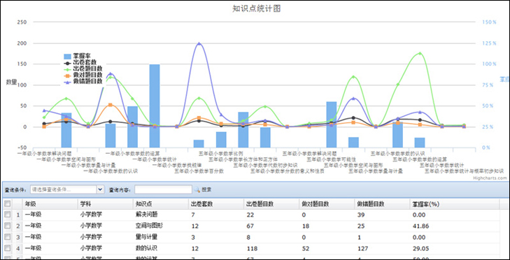 對(duì)于整個(gè)學(xué)科全部知識(shí)點(diǎn),都能自動(dòng)統(tǒng)計(jì),反饋教學(xué)效果,可引導(dǎo)教師做針對(duì)性教學(xué)